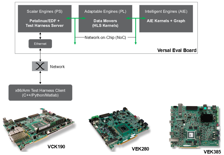 AIE (AI Engine) Test Harness is designed to assist AIE application designers in verifying and benchmarking their designs on the Versal platforms such as the VCK190 and VEK280, with the ease of a software simulator. Most importantly, AIE Test Harness allows the developers to conduct testing across diverse host systems, including x86 and ARM, from various development environments like Matlab and Python.