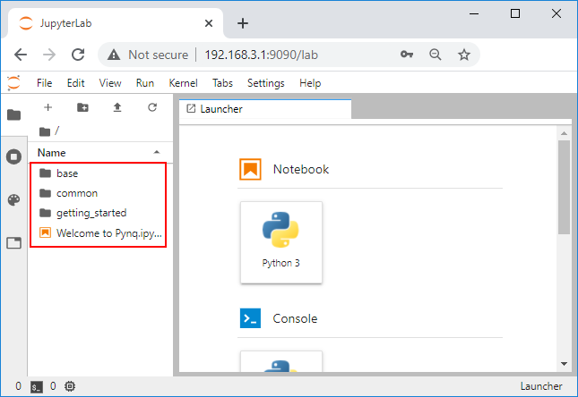 This should bring you to the Jupyter home area where you can start to explore your board with the getting started notebooks.