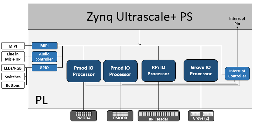 The base overlay on AUP-ZU3 includes IP to connect to the following hardware: