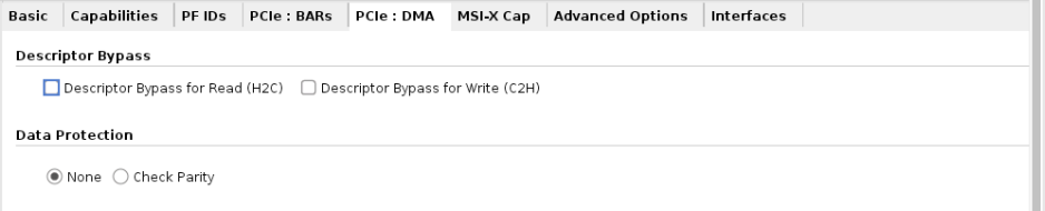 The configuration for the PF0 AXI Bridge Master and PF1 DMA is shown below. These options enable the Master AXI interface within the CIPS IP and is used to interface with AXI peripherals, and also allows for PCIe Host DMA transfers to the memory devices.