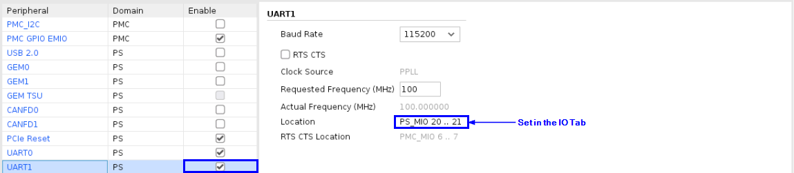 PS_UART1_PERIPHERAL {{ENABLE 1} {IO {PS_MIO 20 .. 21}}} \