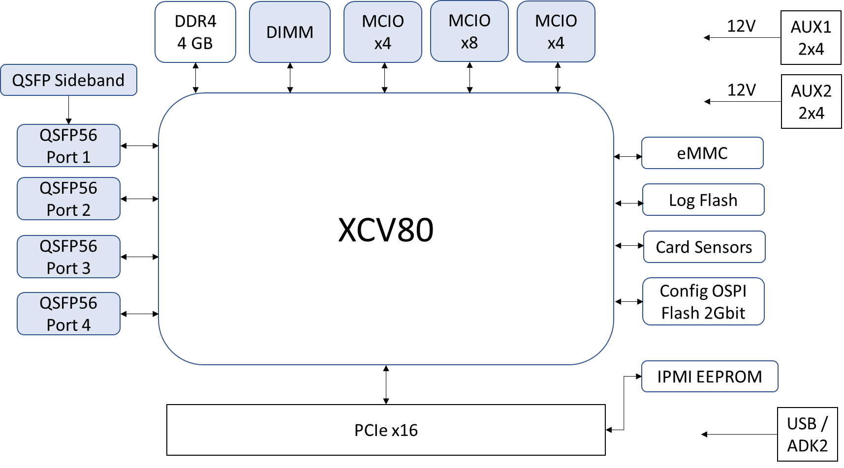 The Alveo V80 is a high performance data processing card in a PCIe form factor containing a Versal HBM FPGA device, DDR memory, and a variety of communication interfaces. The Alveo V80 has a broad range of market applications in high-performance compute, analytics, networking, storage, fintech, and blockchain. The following diagram provides a high level overview of the primary card features and interfaces. See the Alveo V80 Data Center Accelerator Card Data Sheet (DS1013) for information on the card and its capabilities.