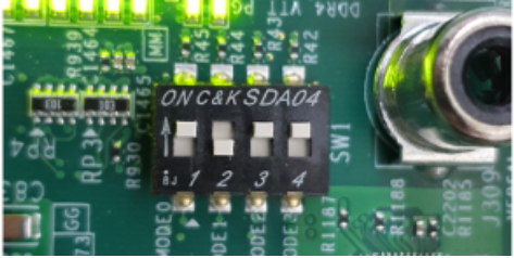 次の図のように、メージをフラッシュ メモリに書き込んだ後、ボードの電源スイッチをオフにし、SW1 ブート モード ピンの設定を QSPI ブート モード (ON-OFF-ON-ON, M[0:3] = 0100) に変更します。