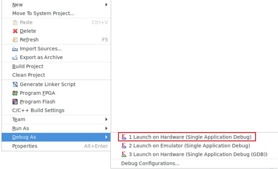 Right-click the application project and select Debug As→ Launch on Hardware (Single Application Debug) as shown in the following figure.