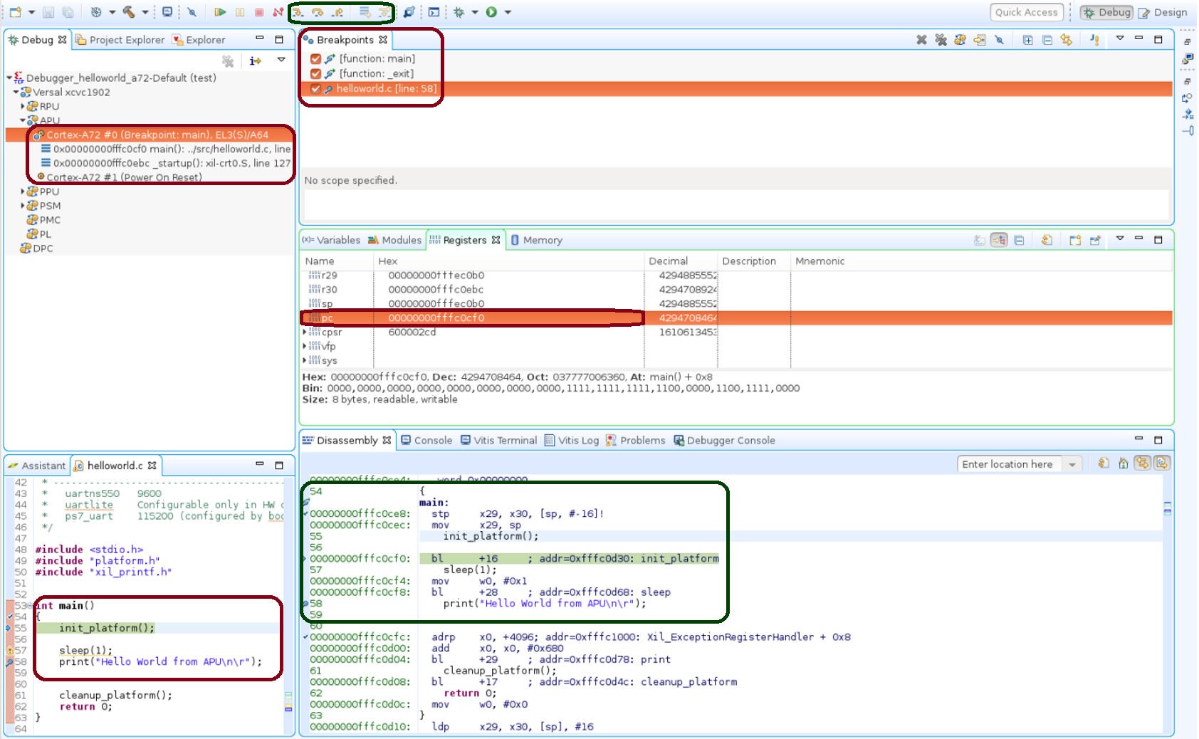 The Vitis software platform debugger enables you to step through your code line by line. You can set breakpoints or watchpoints to stop the processor, step through program execution, view the program variables and stack, and view the memory contents in the system.
