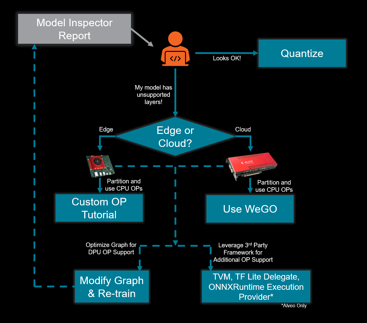 Several paths are available to leverage an operator not supported for acceleration on the DPU, including C/C++ code or custom HLS or RTL kernels. However, these DIY paths pose specific challenges related to the partitioning of a trained model. For most developers, a workflow that supports automated partitioning is preferred.