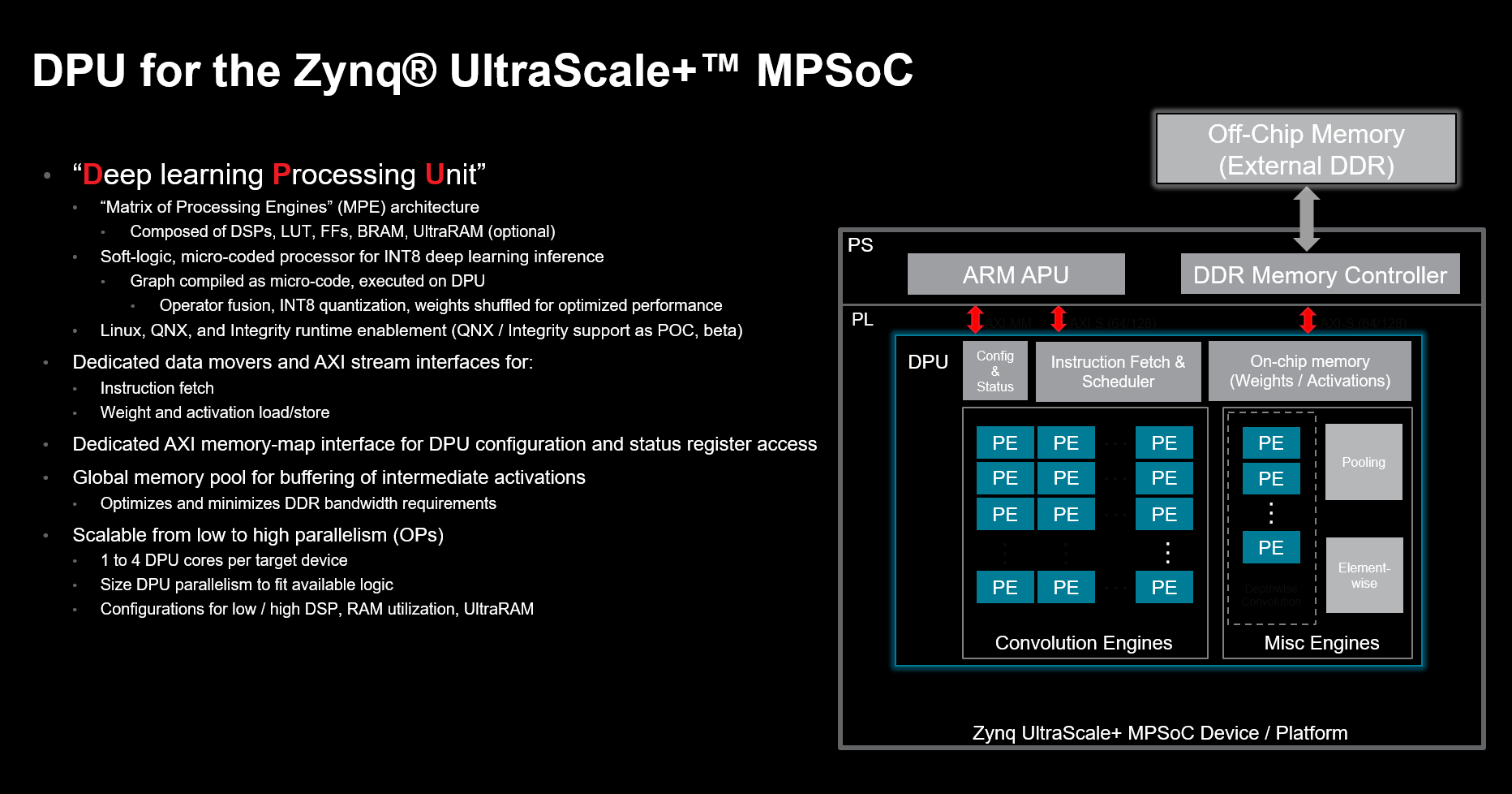 A DPU comprises elements available in the AMD programmable logic fabric, such as DSP, BlockRAM, UltraRAM, LUTs, and Flip-Flops, or may be developed as a set of microcoded functions that are deployed on the AMD AI Engine, or “AI Engine” architecture. Furthermore, in the case of some applications, the DPU is likely to be comprised of programmable logic and AI Engine array resources.