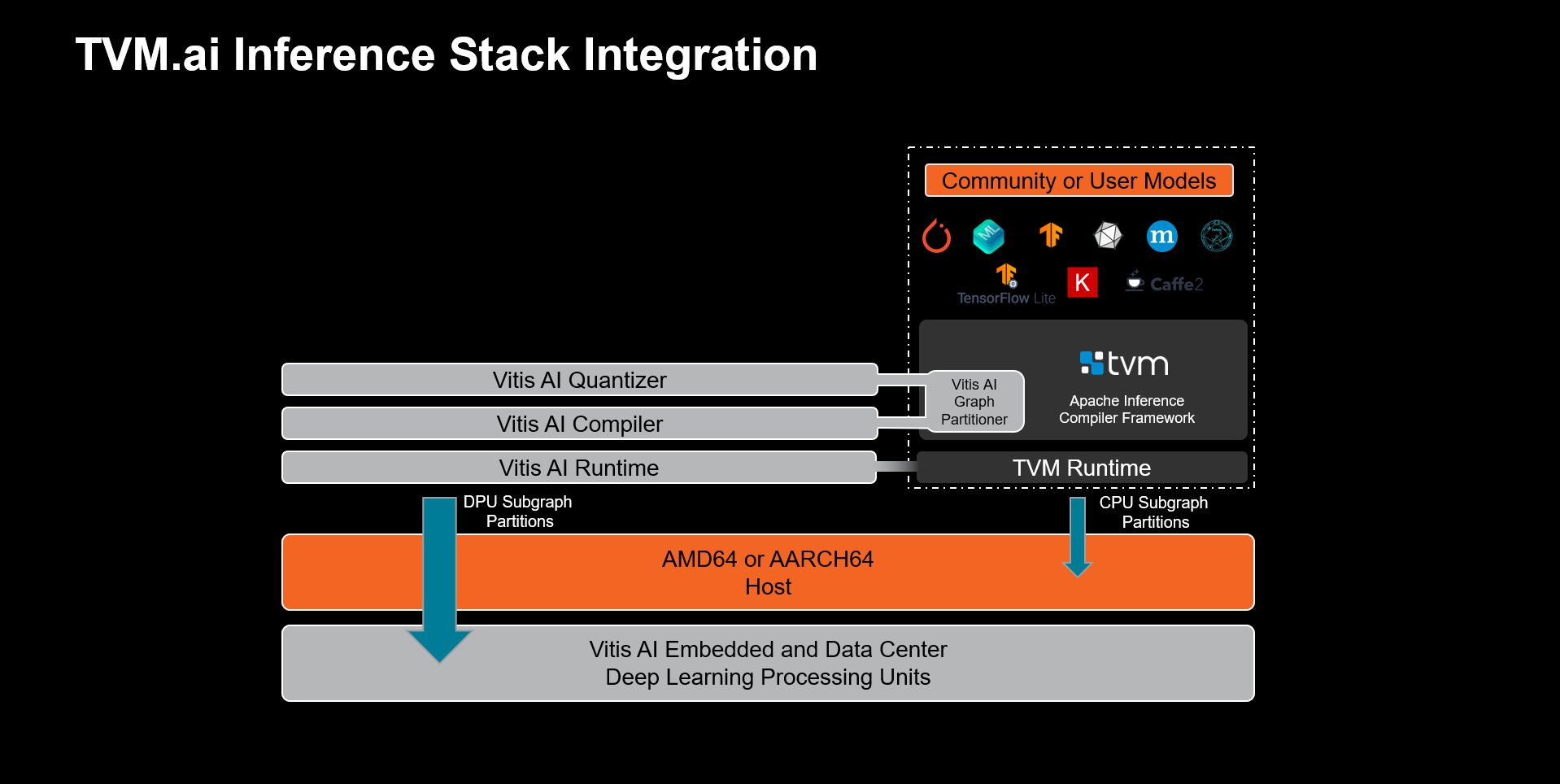 TVM.ai is an Apache Software Foundation project and inference stack that can parse machine learning models from almost any training framework. The model is converted to an intermediate representation (TVM relay), and the stack can then compile the model for various targets, including embedded SoCs, CPUs, GPUs, and x86 and x64 platforms. TVM incorporates an open-source programmable-logic accelerator, the VTA, created using the AMD HLS compiler. TVM supports partitioning a graph into several sub-graphs. These sub-graphs can be targeted to specific accelerators within the target platform (CPU, GPU, VTA, and so on) to enable heterogeneous acceleration.