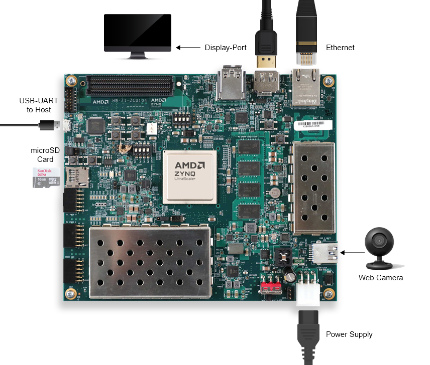 For ZCU102 and ZCU104, please use a display port monitor and reference the respective user guide to configure the target jumper and switch settings to factory defaults. For both the ZCU102 and ZCU104, set Mode SW6 [4:1] = [OFF, OFF, OFF, ON] to boot from SD card.